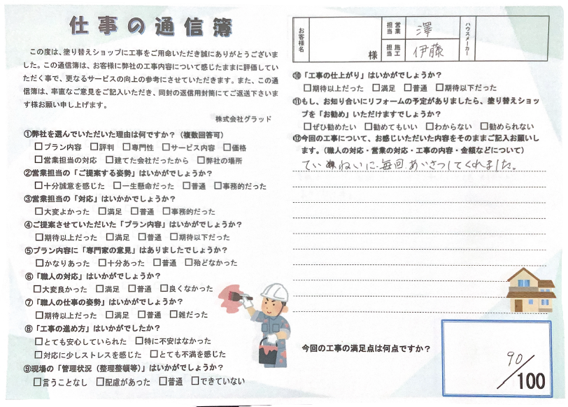 - Ⅰ様この度は塗り替えショップをご利用いただき誠にありがとうございます。期待にお応えでき何よりです。お褒めのお言葉を頂戴することができとても光栄に存じます。今後ともどうぞよろしくお願い申し上げます。